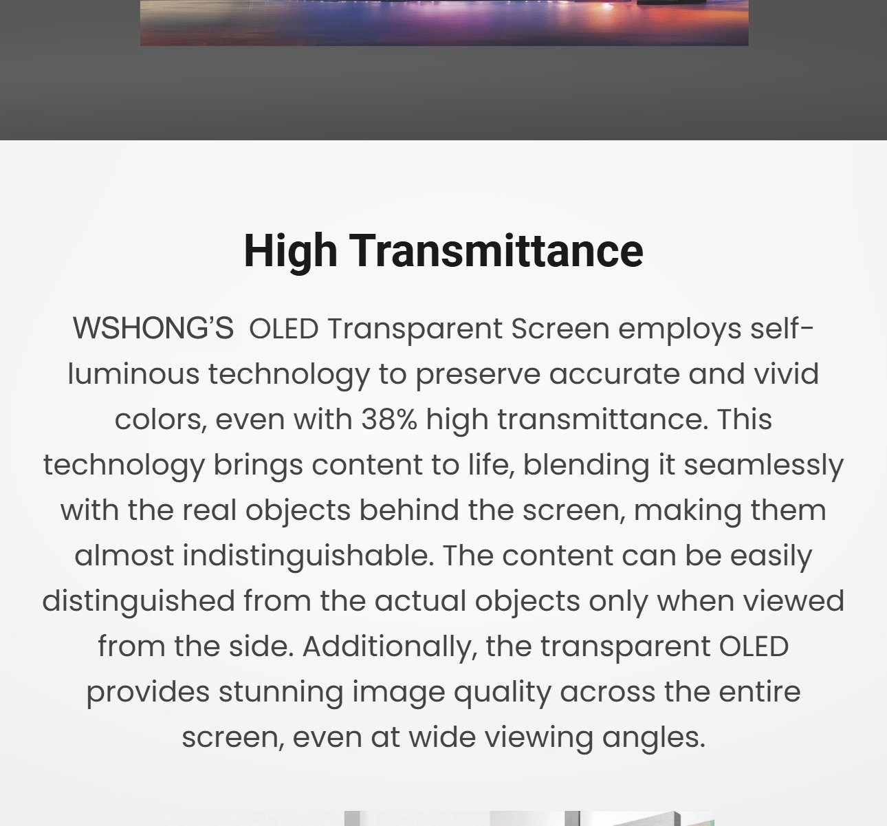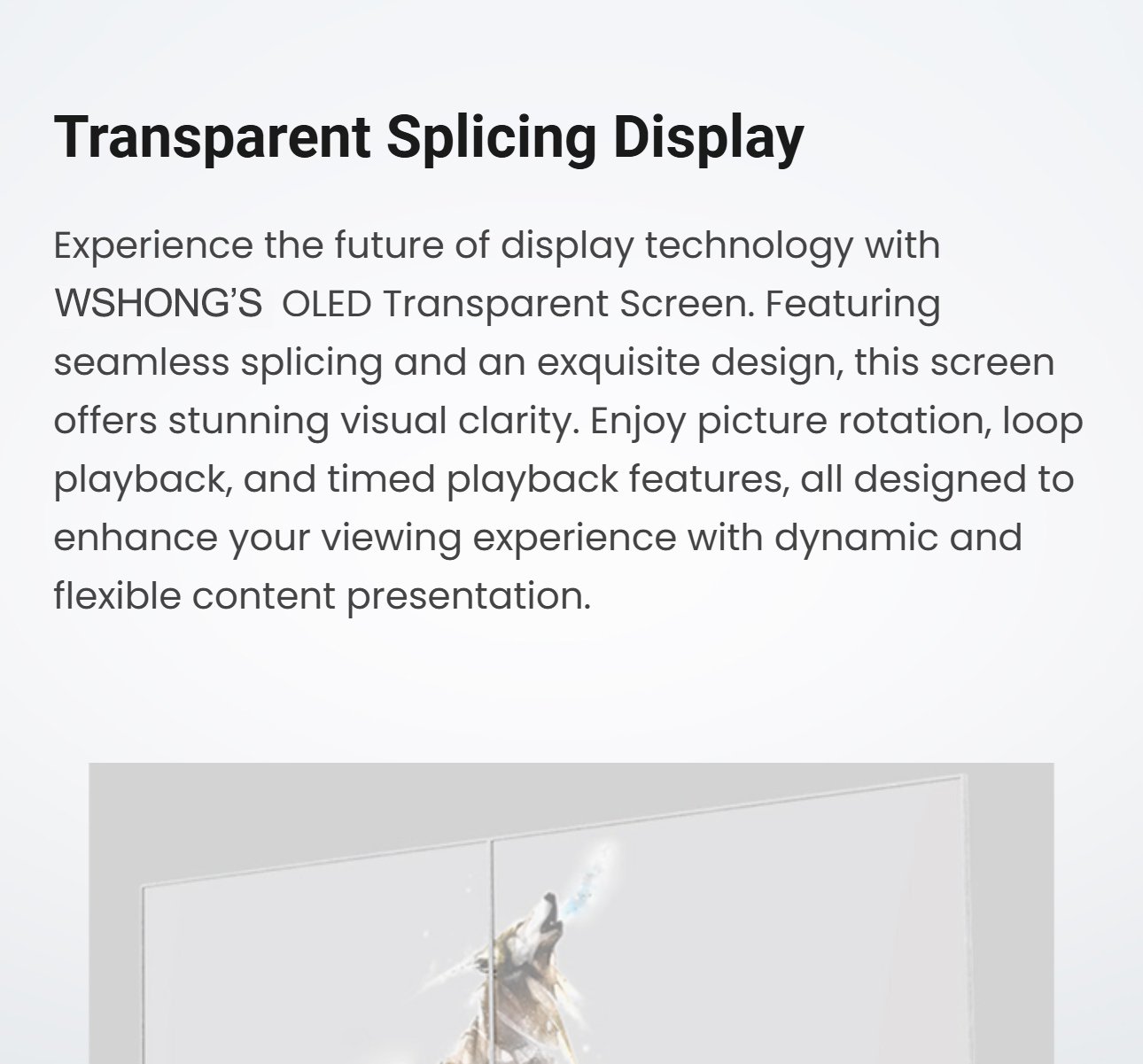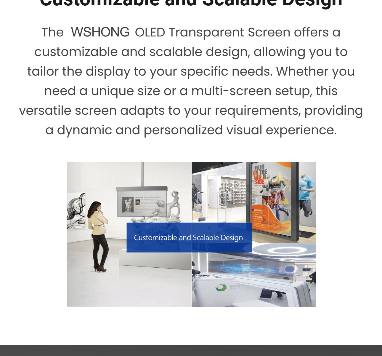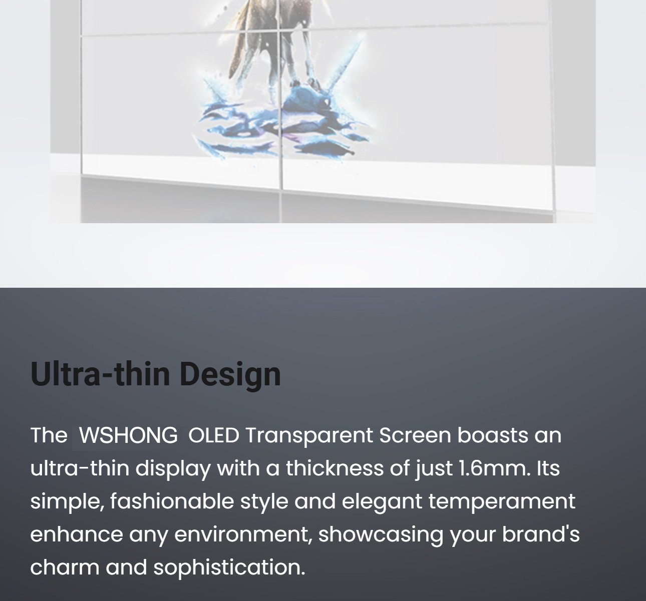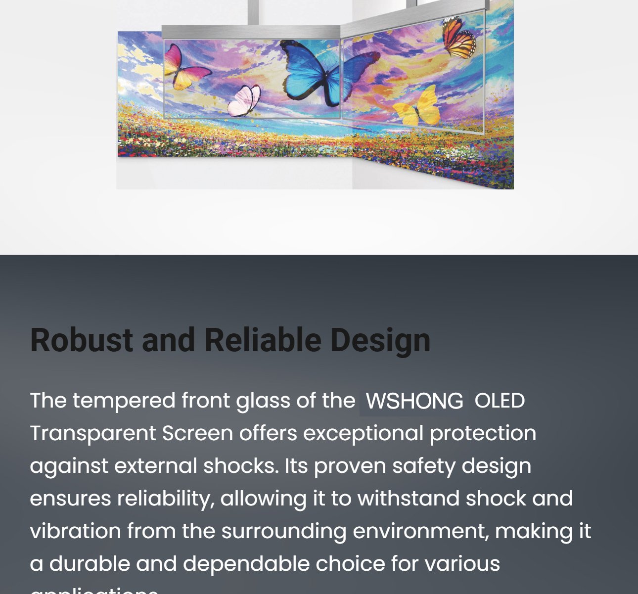 OLED transparent displays offer high brightness and transparency. Tempered glass provides excellent external impact protection! Transparent OLED screens offer excellent dynamic clarity and high transparency, seamlessly blending in with the surroundings and revealing the space behind the display.