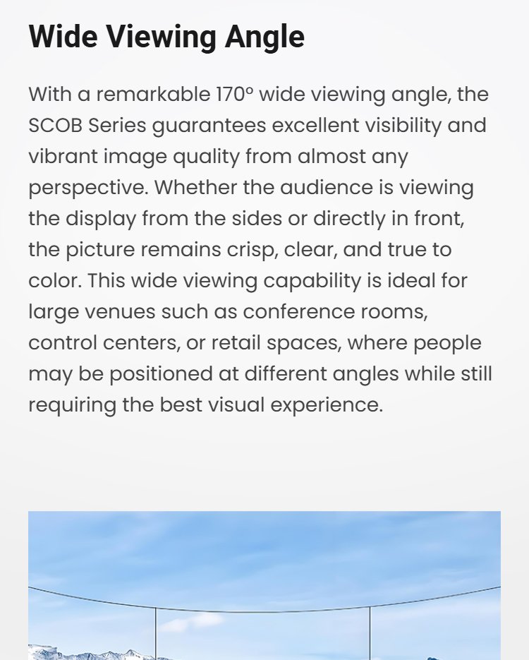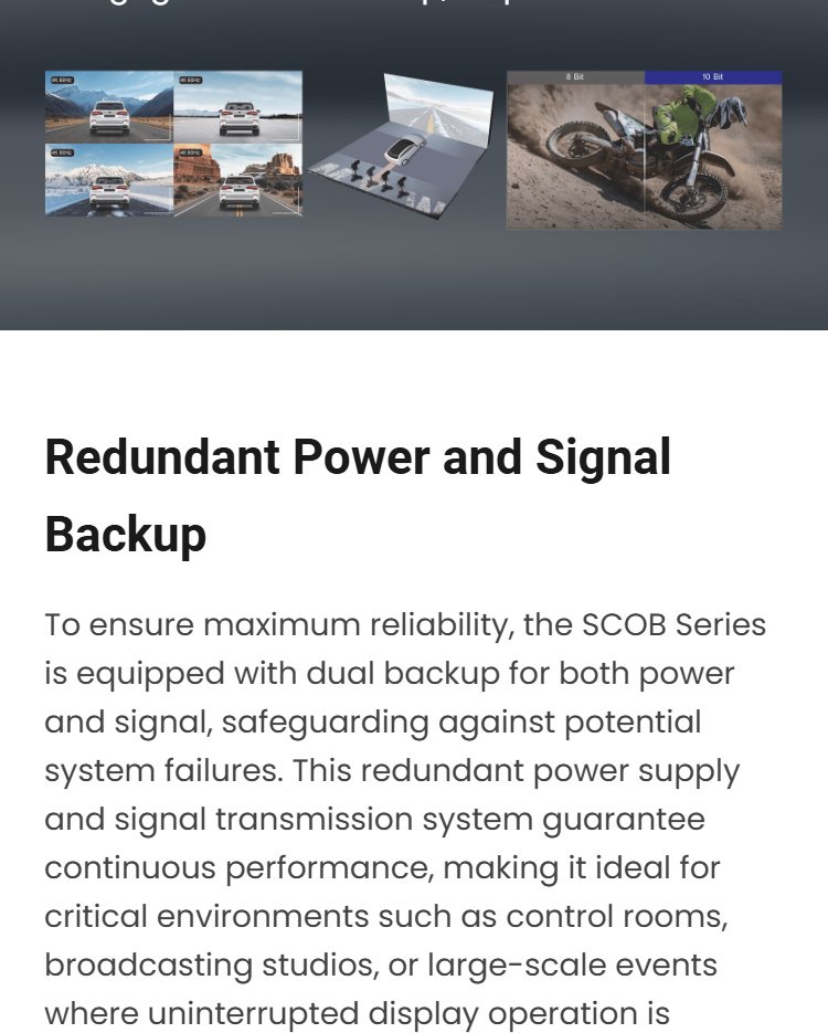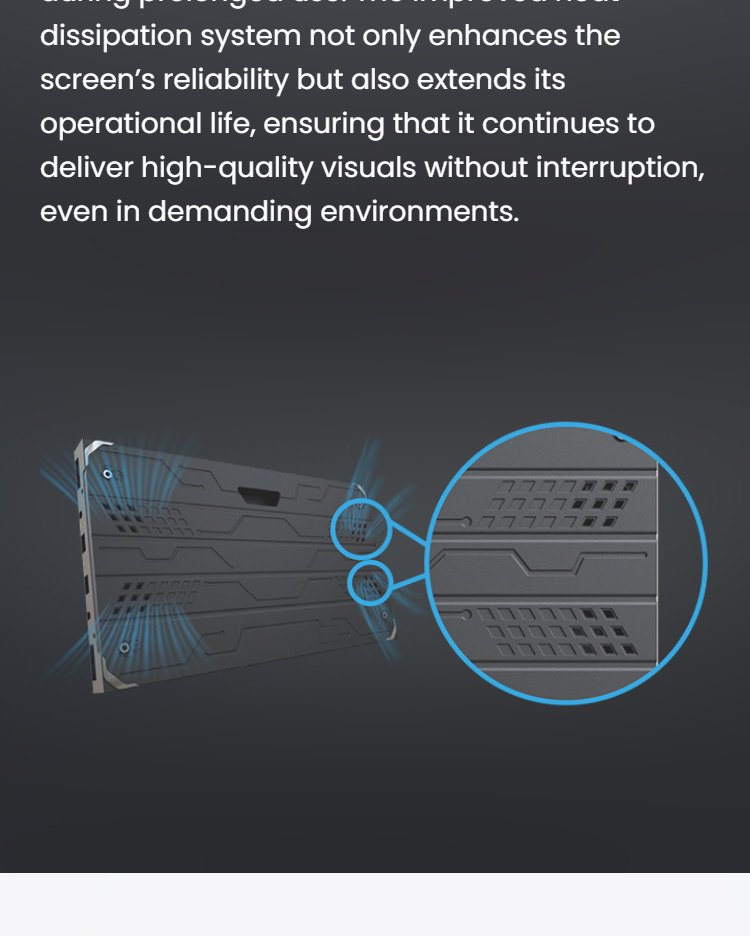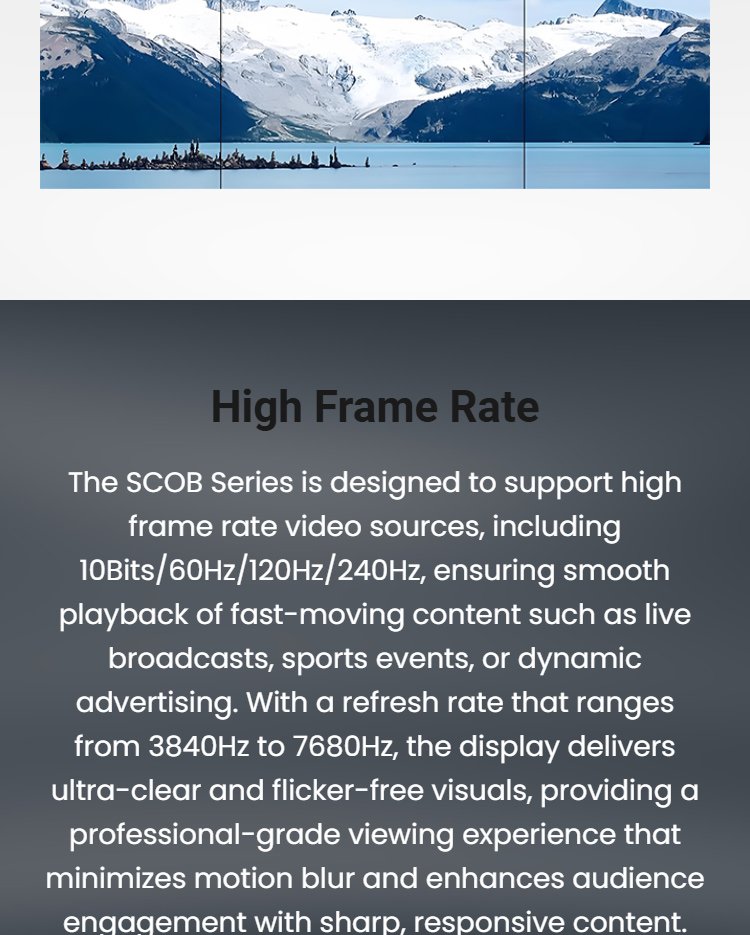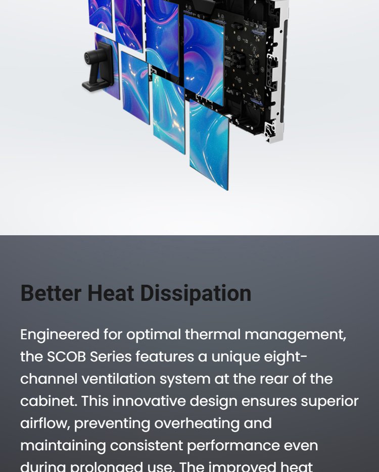 The SCOB series of LED displays, with their precision design and die-cast aluminum cabinet construction, are both aesthetically pleasing and durable, making them ideal for high-quality visual installations. Utilizing advanced 5G transmission technology, faster data transfer is possible, reducing latency and ensuring smooth, high-quality visual output.