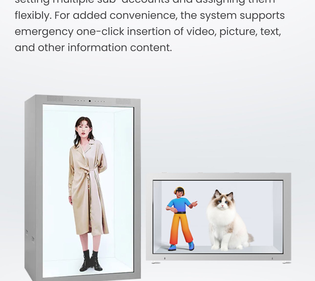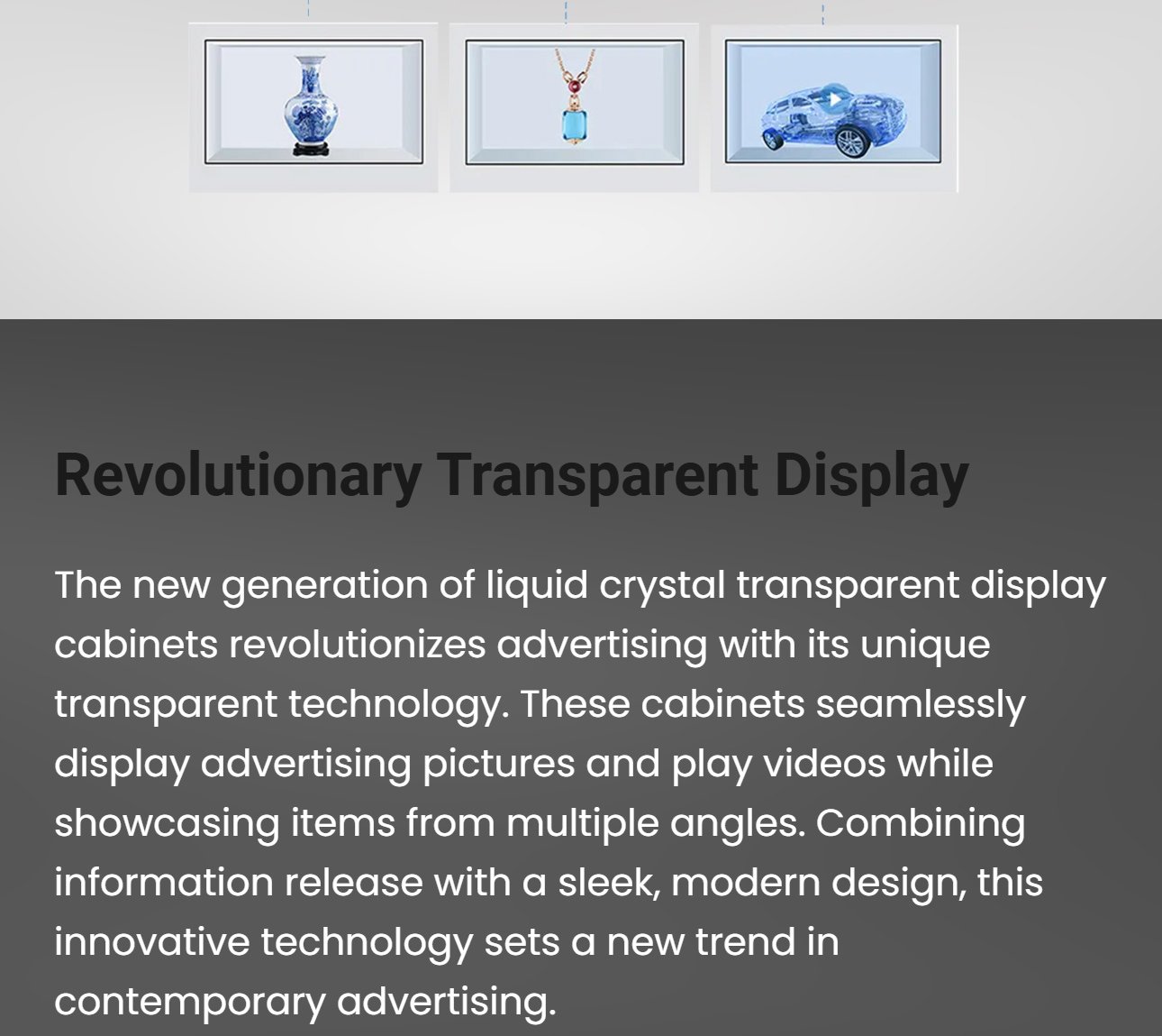 The new LCD transparent display case, the unique transparent technology is a trend carrier when many high-end products are promoted. You can introduce the products in the display cabinet with multi-angle images, videos and text, which is both simple and fashionable.