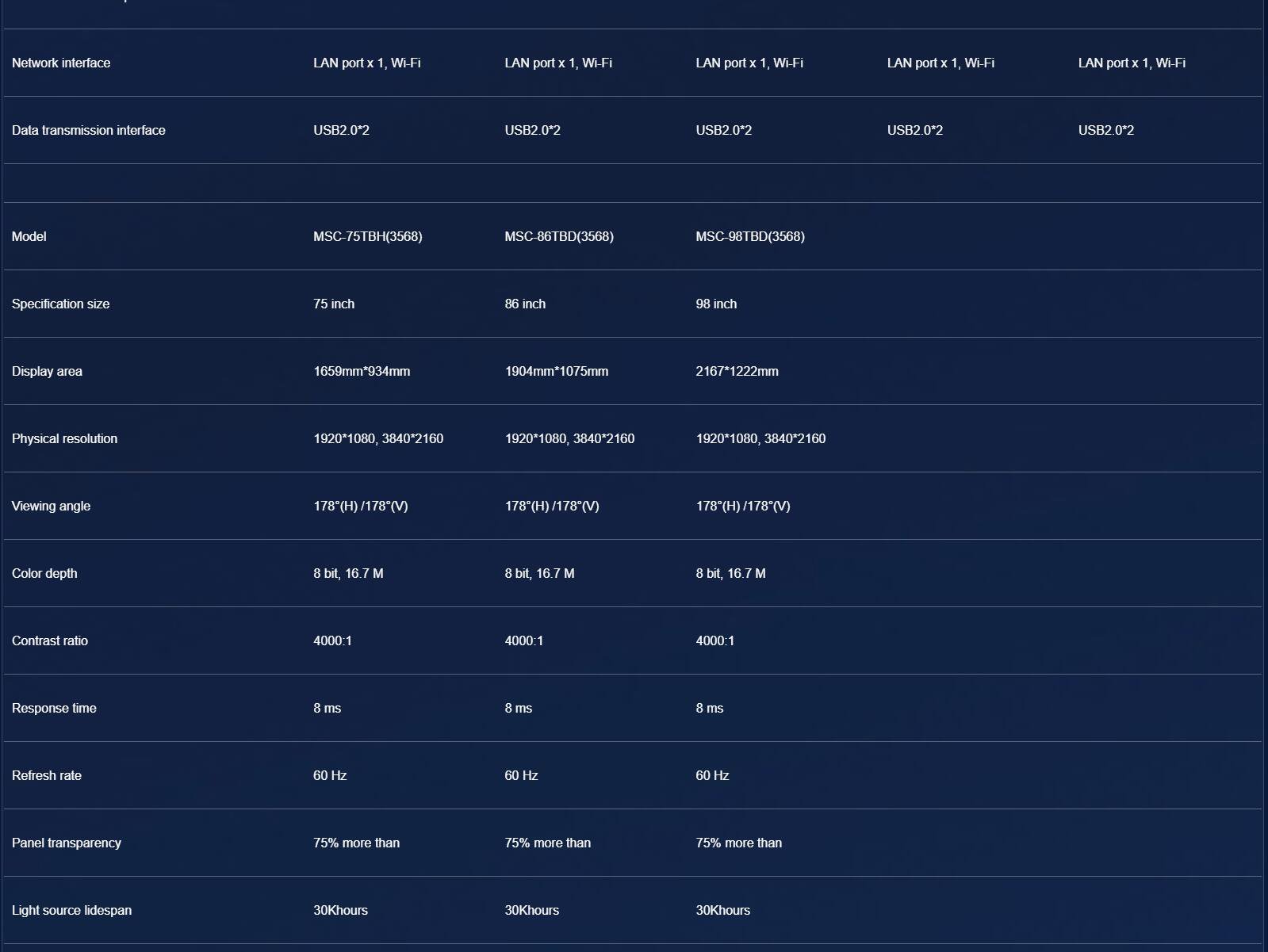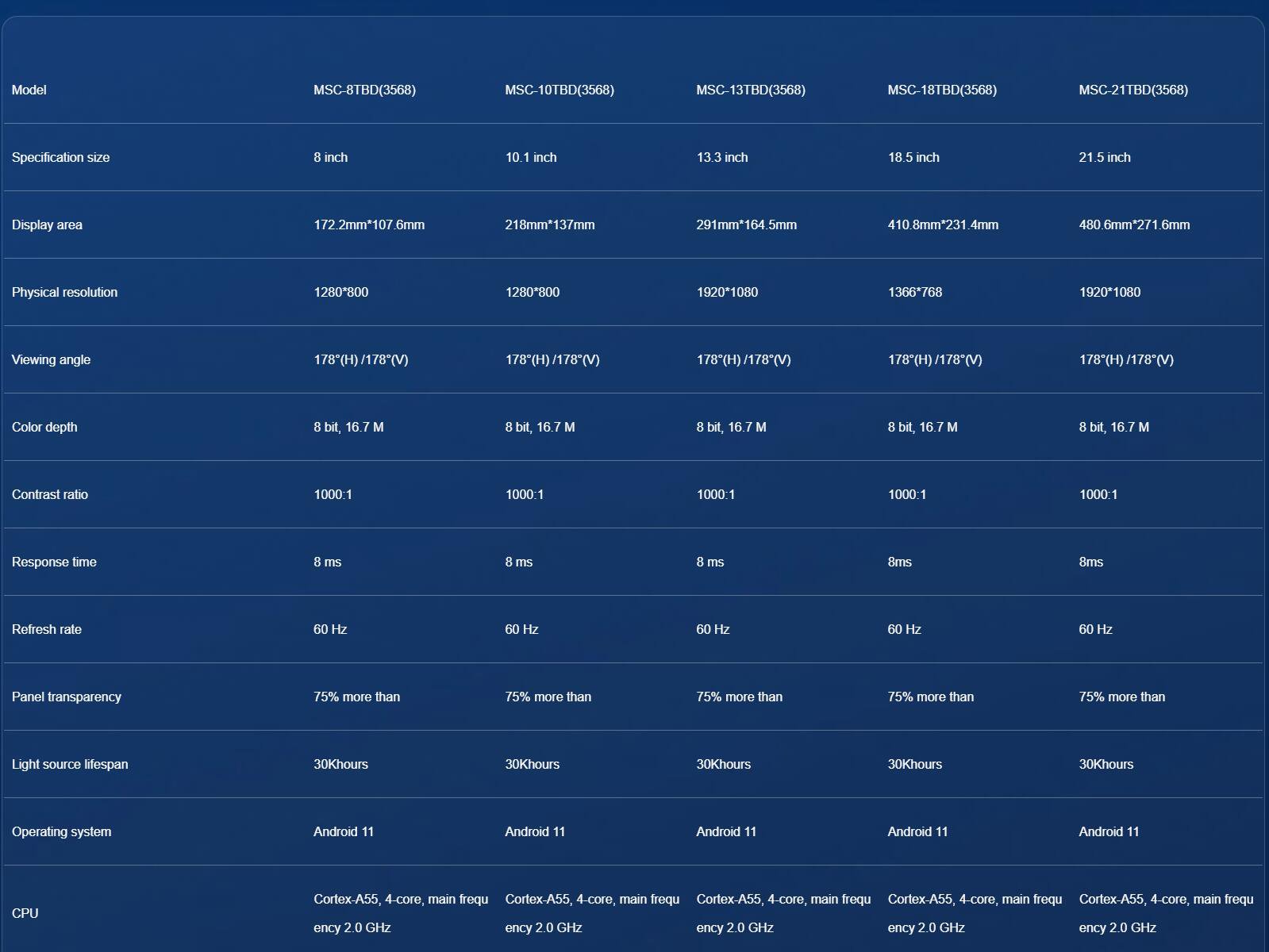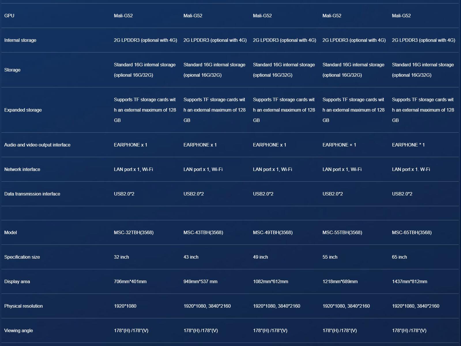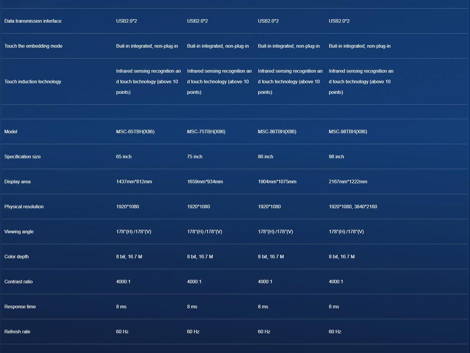 • Specification size: 8/10.1/13.3/18.5/21.5/32/43/49/55/65/75/86/98inch